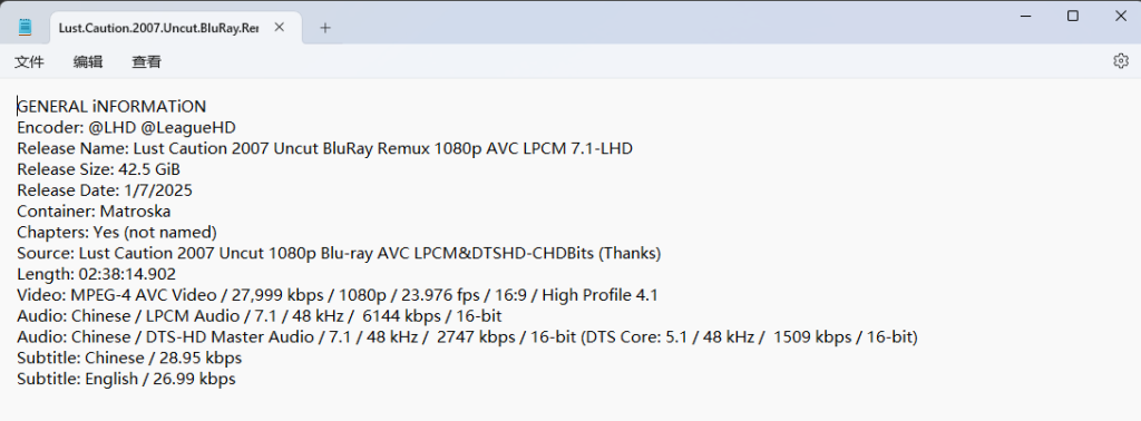 最近我想一部电影《色戒》,找了一个网站《色,戒》未删减完整版蓝光原盘1080P高码率【42.27GB/高音质LPCM】-电影区-零零盘把资源下载下来了,但发现就只有一个只有一个.nfo文件,根本不知道是什么东东。