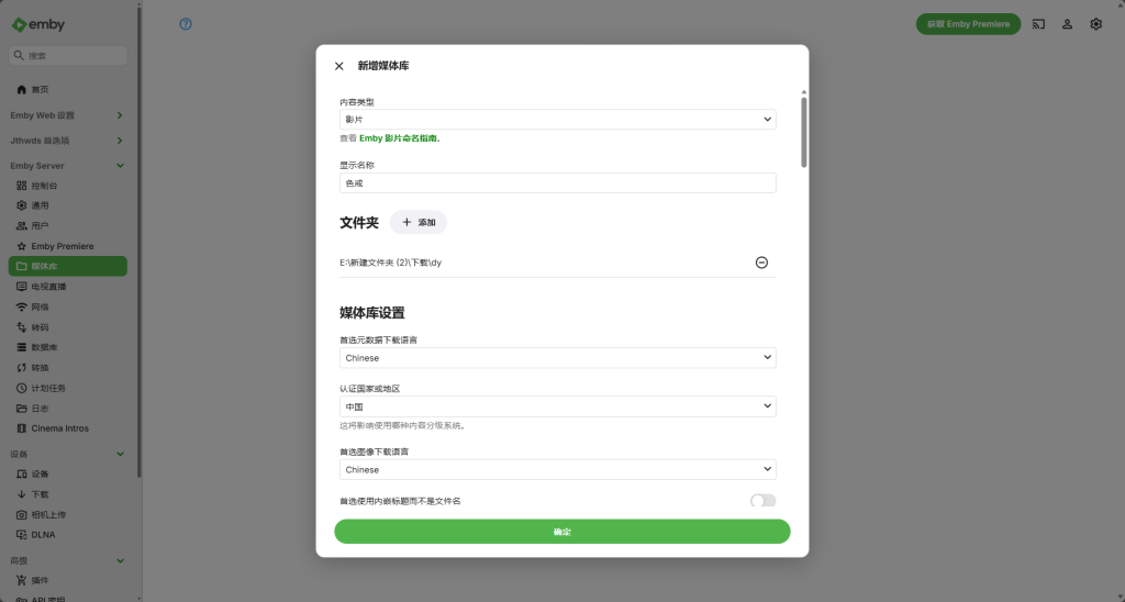 内容类型选第一个,名称看你自己取,文件夹找到你放文件的地方,媒体库设置全中国呢,其他的可以不弄直接点确定。