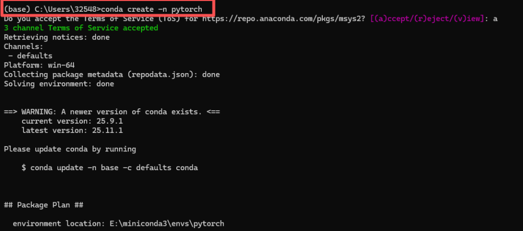 输入conda create -n pytorch来创建一个新的环境,-n后面是你的环境的名称,你可以自己取的。