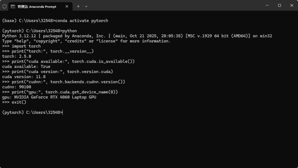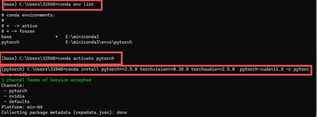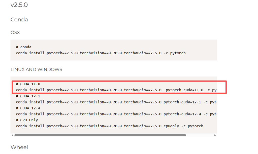 我选择的是pytorch2.5的版本,cuda是11.8的,conda install pytorch==2.5.0 torchvision==0.20.0 torchaudio==2.5.0 pytorch-cuda=11.8 -c pytorch -c nvidia