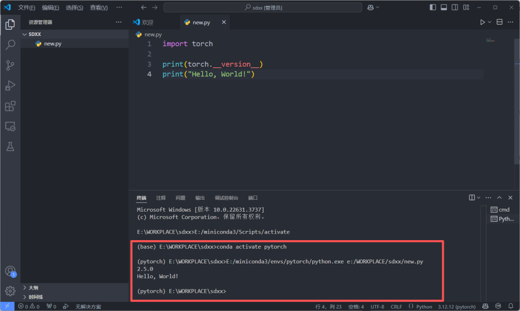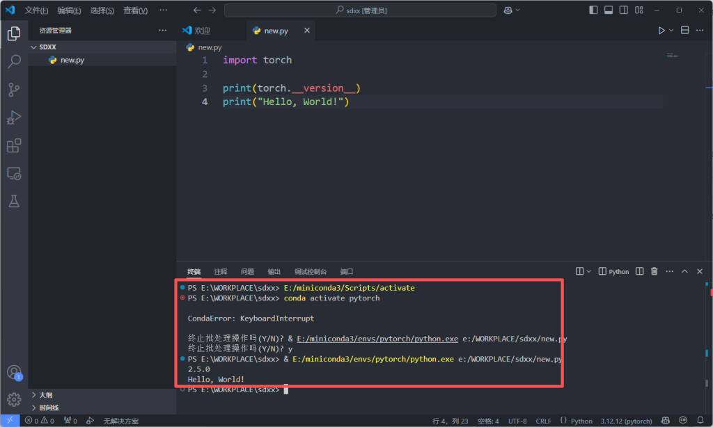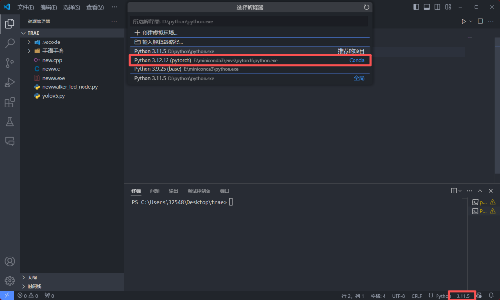 最后说一下怎么在Vscode里使用这个环境呢,点击界面的右下角的版本号,在上面就会显示你有的所以版本信息,选用你用conda创建的环境就行了。