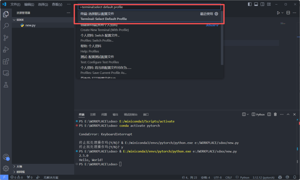 键盘输入ctrl+shifl+P,然后输入teminal:select default profile选择。