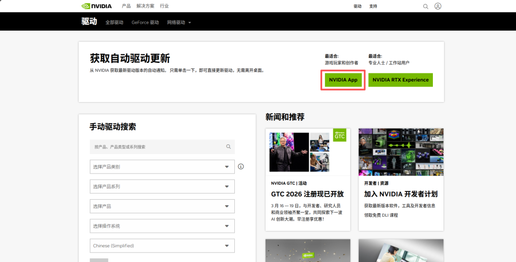 搜索英伟达,点击驱动程序,找到NVIDIA APP下载就可以下载驱动了。针对于Game Ready Driver(游戏驱动)和Studio Driver(创作者驱动)其实没什么太大区别,都可以下载的,主要区别就是Game Ready Driver 面向新游戏首发和性能优化、更新快但稳定性次之,而 Studio Driver 面向创作与科研场景、更新慢但经过专业软件充分验证、稳定性优先。