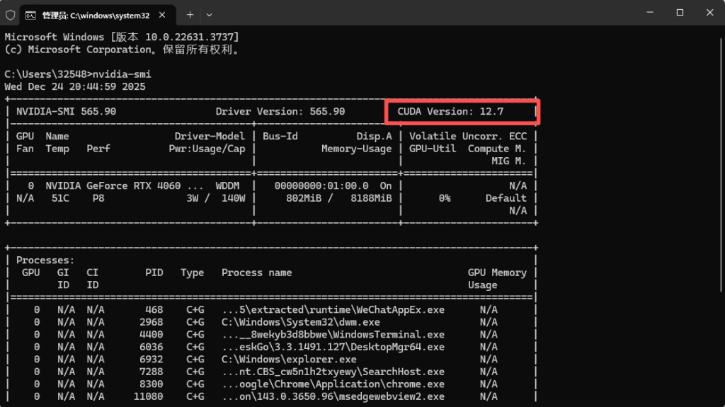 首先我们查看一下我们电脑最高能装多少版本的CUDA,win+R输入cmd打开终端,在终端中输入nvidia-smi,这上面显示了我能安装的CUDA版本最高的就是12.7。
