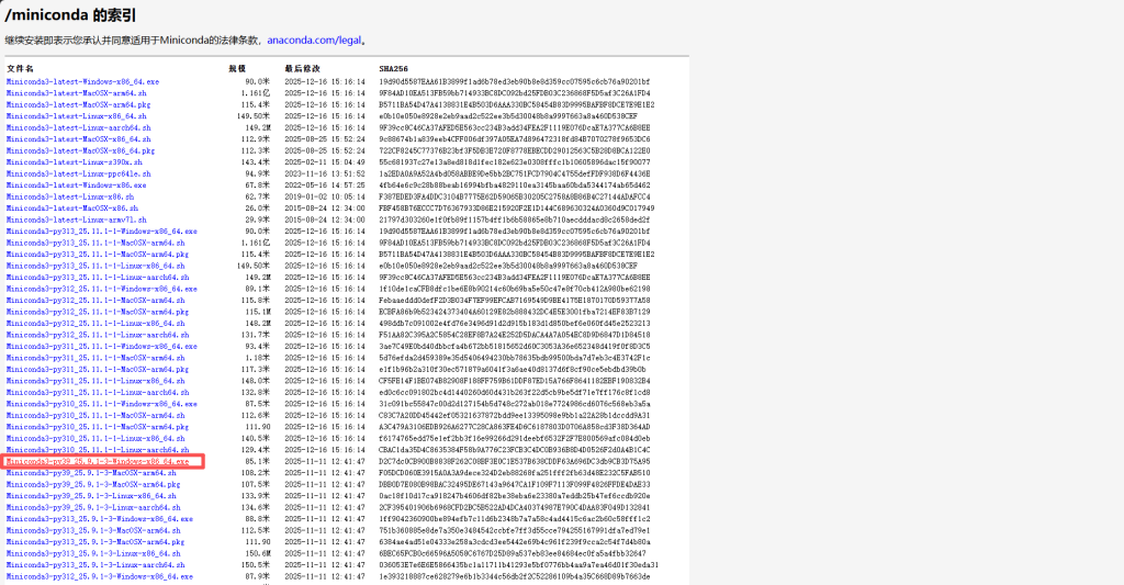 我选择下载这个miniconda-py39的版本Miniconda3-py39_25.9.1-3-Windows-x86_64.exe,因为他的修改日期比较有意思。大家可以自己看着下载,都差不多。