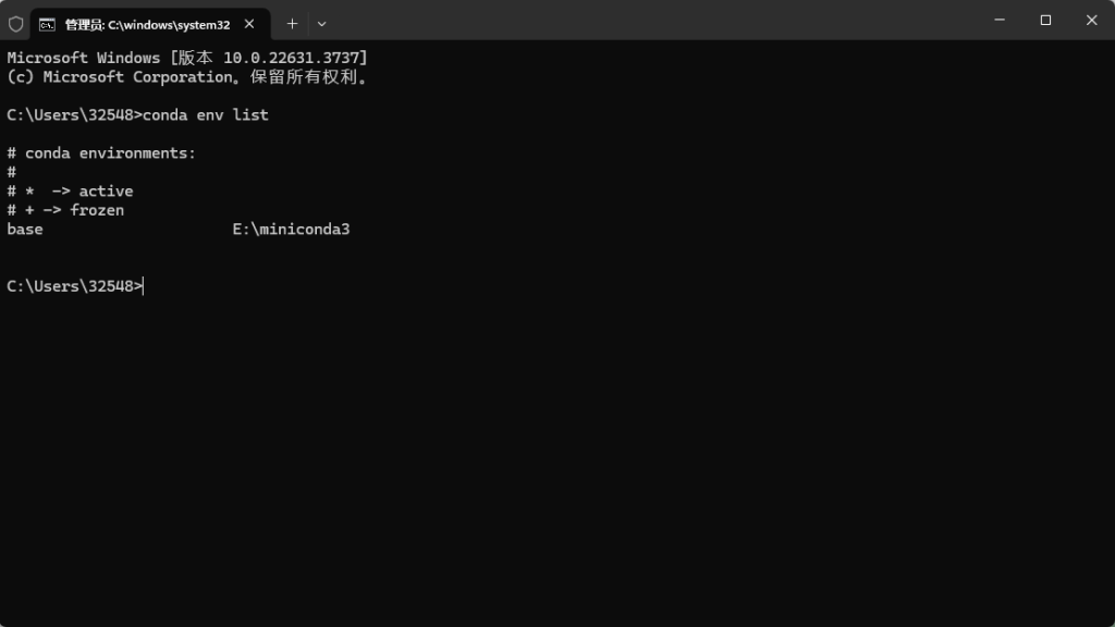 然后打开终端输入conda env list就可以查看我们现在又的环境了,如果我们在上一步没勾选第二个的话,这里是不能直接在系统终端里实现conda命令的,需要在anaconda自带的终端里才能用呢。