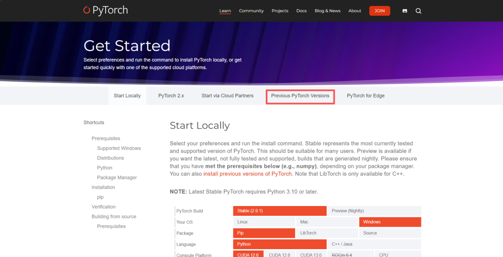 点击Previous PyTorch Versions之前的PyTorch版本,还是不要下载最新的呢,下载以前的版本。