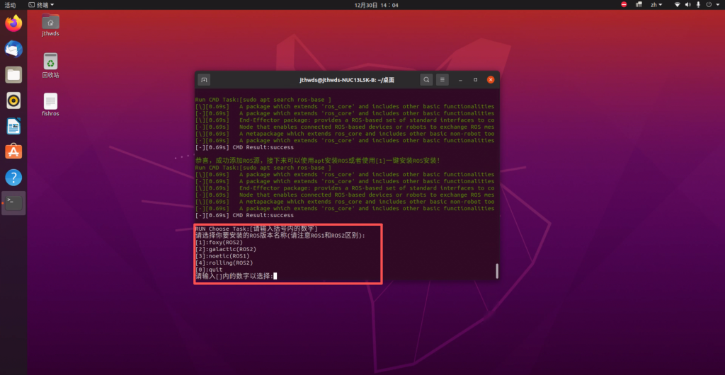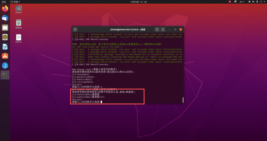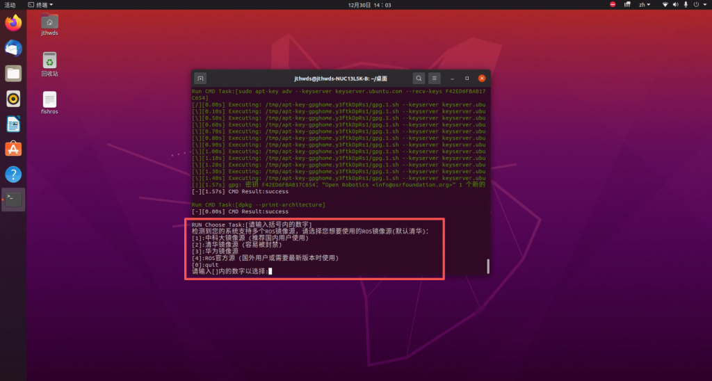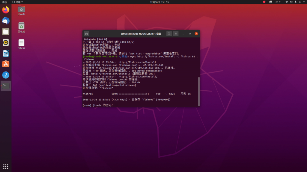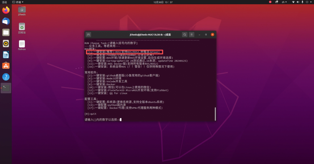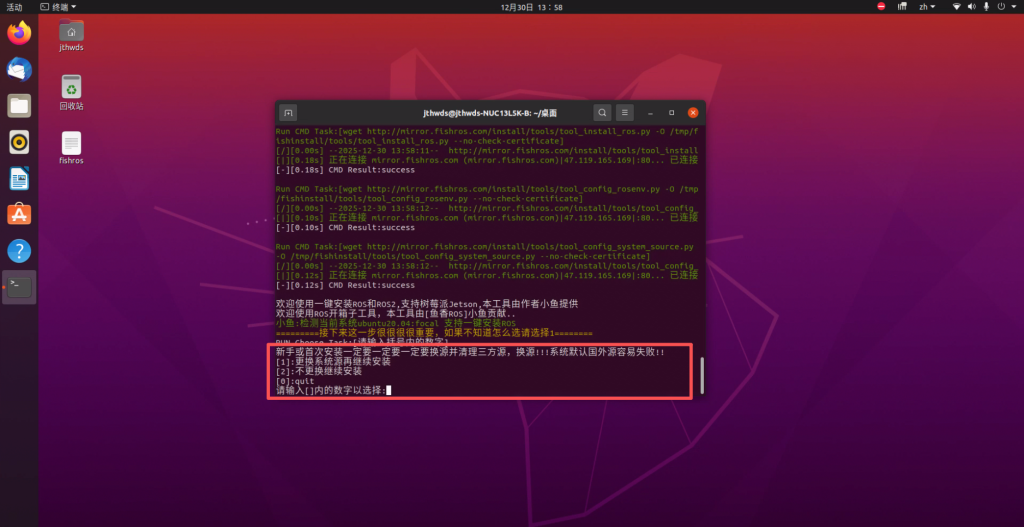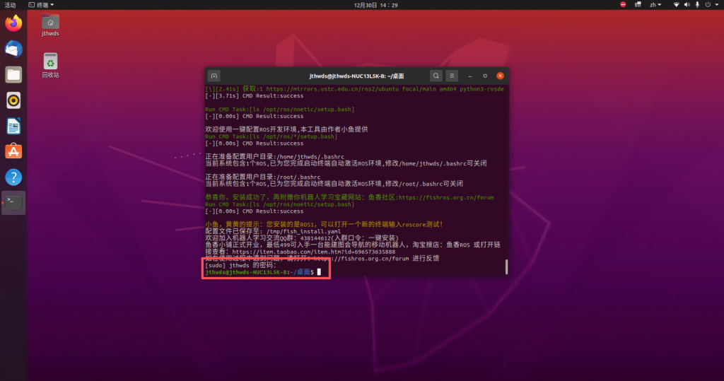 然后输入wget http://fishros.com/install -O fishros && . fishros,然后输入密码就可以进行一键安装了,同时你有也可以去小鱼的一键安装系列 | 鱼香ROS的网站看看。